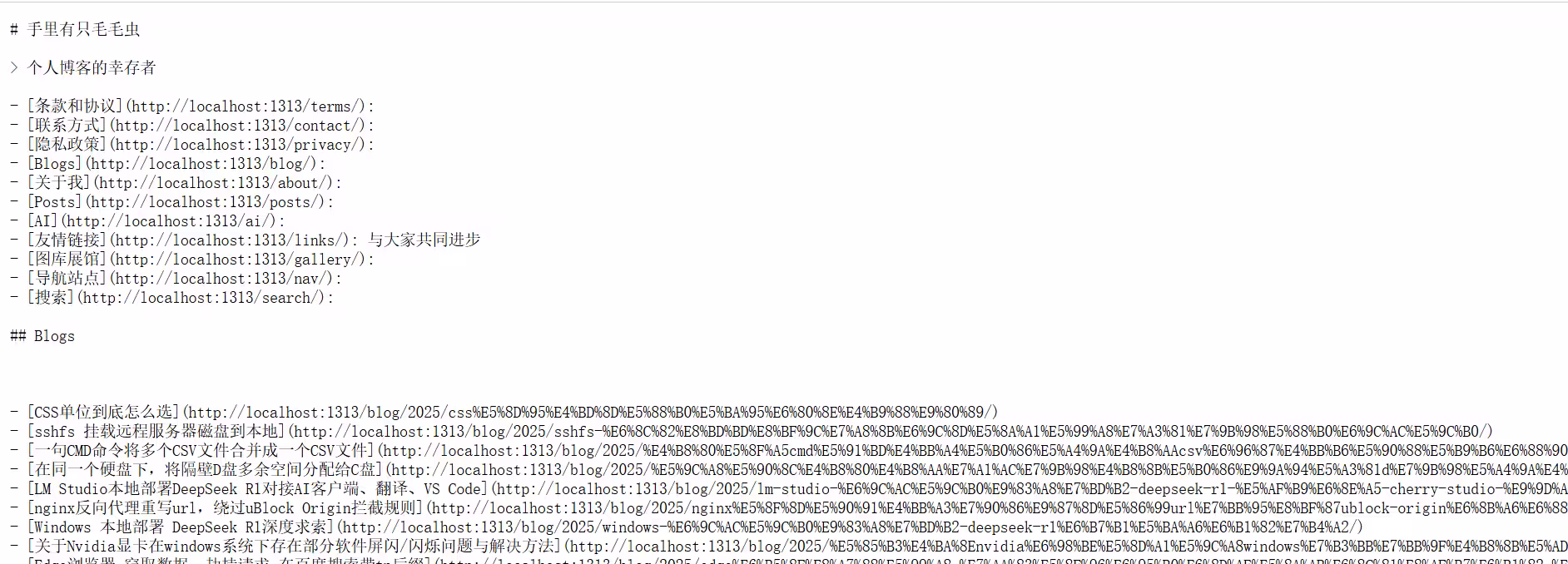 我们需要修改llms.txt,把 {{ .Permalink }} 改写成 {{ (.OutputFormats.Get "MARKDOWN").Permalink }} ,来指向之前 outputFormats 设置的md格式