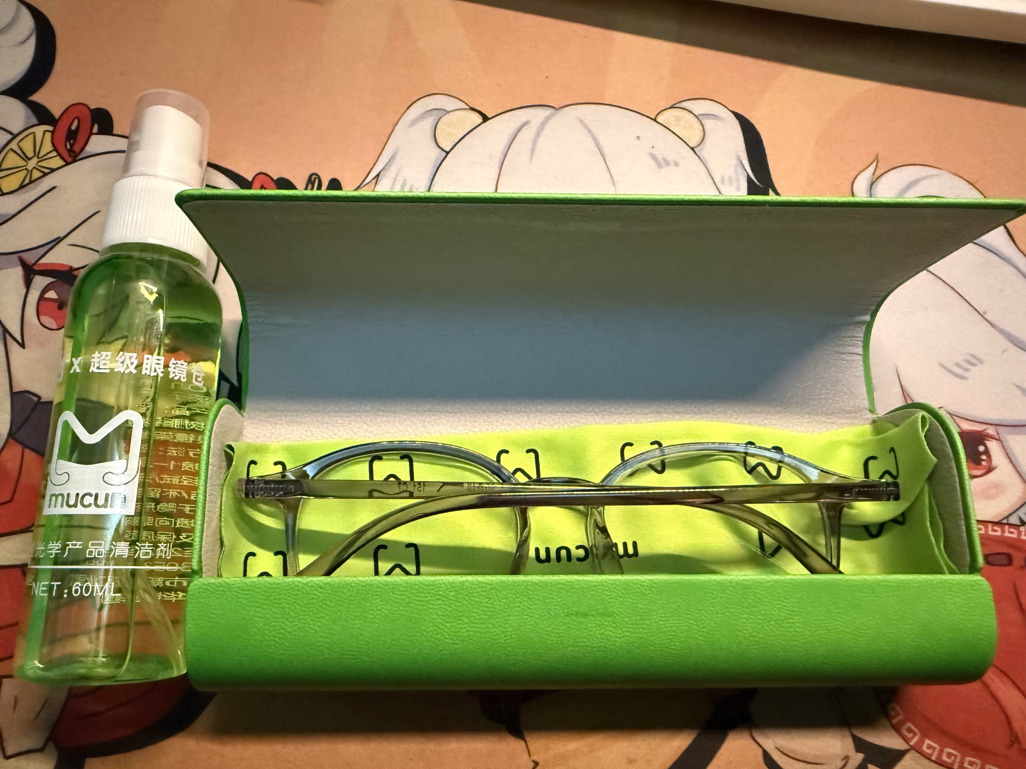一瓶未知成分的清洁剂,眼镜盒,眼镜布,眼镜本体